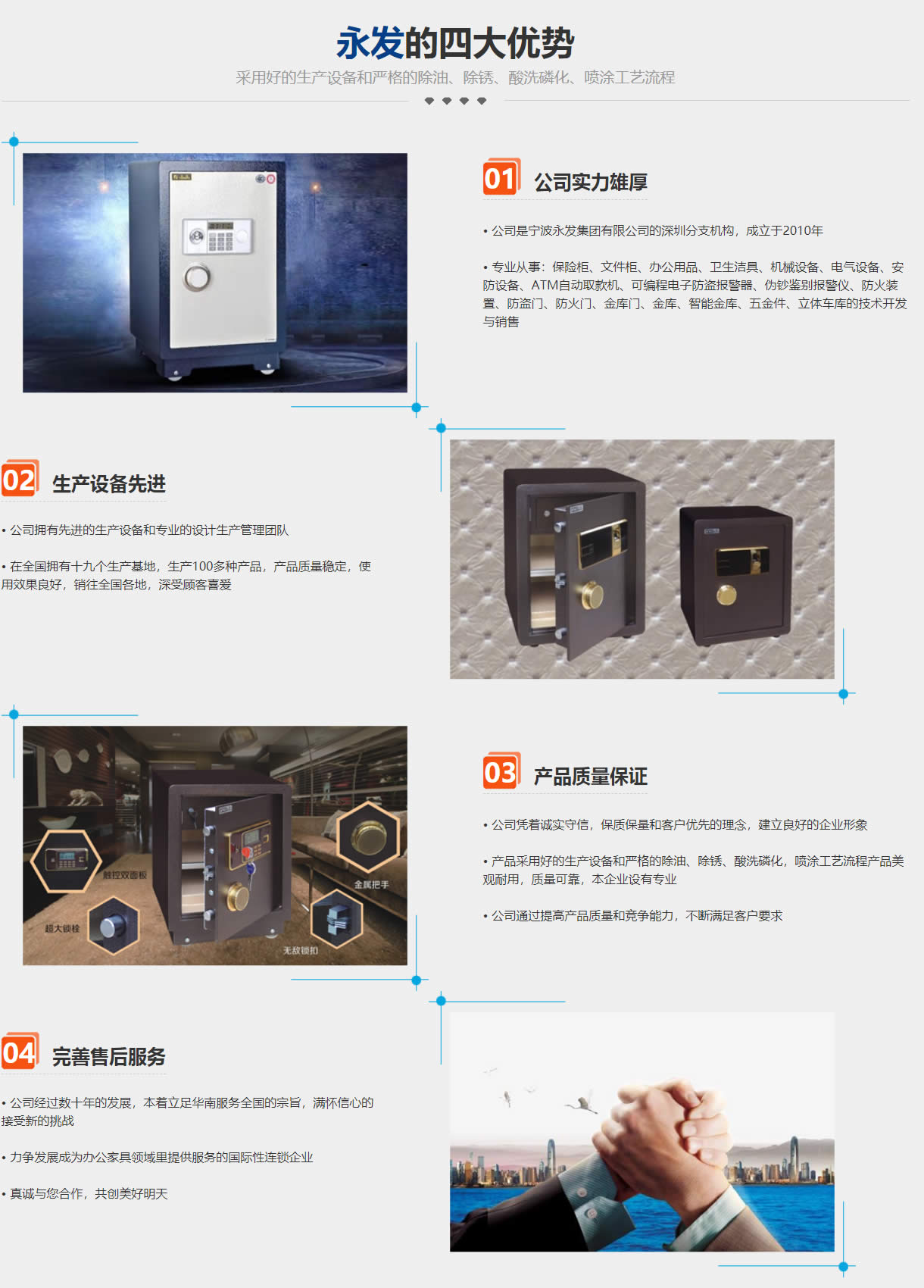 深圳永發(fā)安防產品有限公司 深圳永發(fā)安防產品有限公司,是寧波永發(fā)集團有限公司的深圳分支機構,成立于2010年,專業從事:保險柜、文件柜、辦公用品、衛(wèi)生潔具、機械設備、電氣設備、安防設備、ATM自動取款機、可編程電子防盜報警器、偽鈔鑒別報警儀、防火裝置、防盜門、防火門、金庫門、金庫、智能金庫、五金件、立體車庫的技術開發(fā)與銷售。